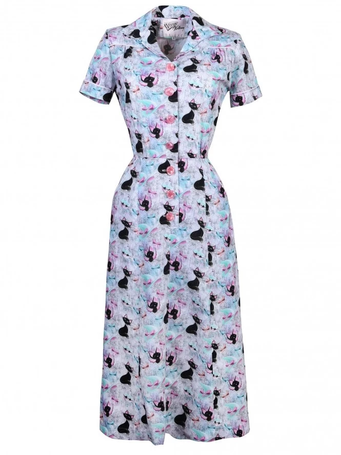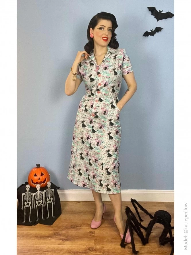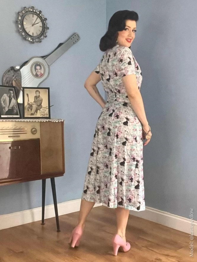This cute dress features cute piping detail and a button-through blouson top that’s slightly gathered at the waist and bust with gently padded shoulders, to give that authentic 1940s silhouette. The A-line skirt skims over your hips and arrives below the knee. She of course has pockets, a lovely design feature and a practical essential.