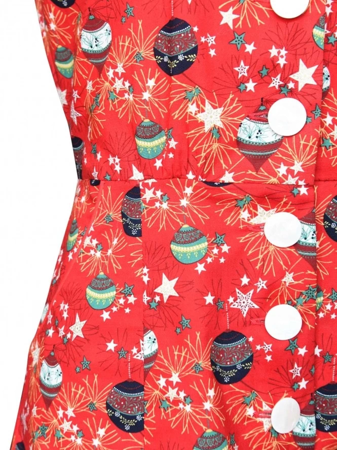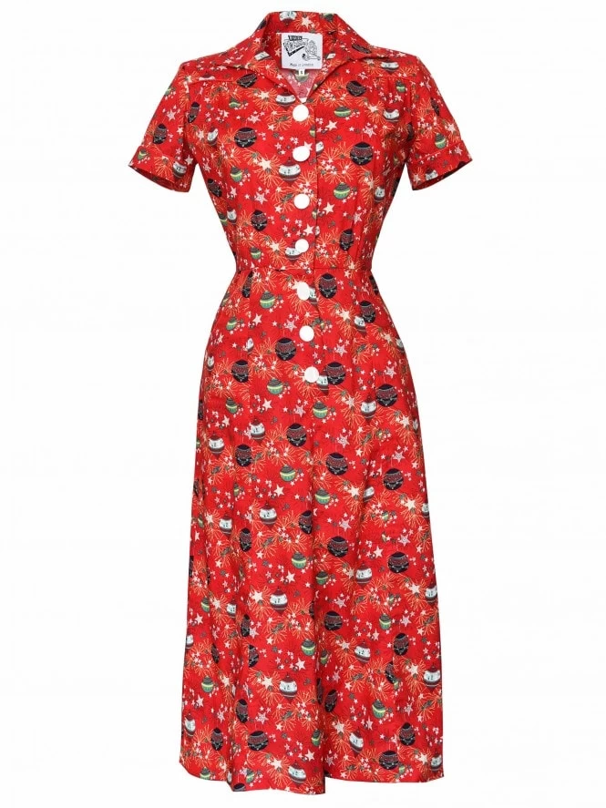 This cute dress features cute piping detail and a button-through blouson top that’s slightly gathered at the waist and bust with gently padded shoulders, to give that authentic 1940s silhouette. The A-line skirt skims over your hips and arrives below the knee. She of course has pockets, a lovely design feature and a practical essential.