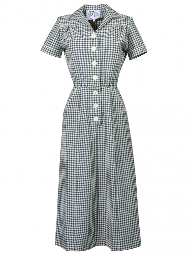 This cute dress features cute piping detail and a button-through blouson top that’s slightly gathered at the waist and bust with gently padded shoulders, to give that authentic 1940s silhouette. The A-line skirt skims over your hips and arrives below the knee. She of course has pockets, a lovely design feature and a practical essential.