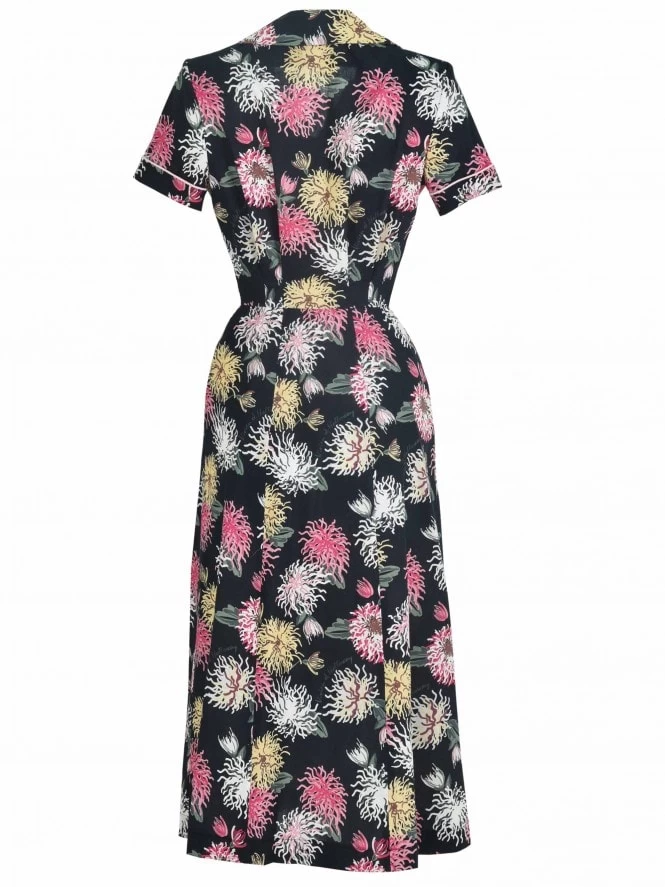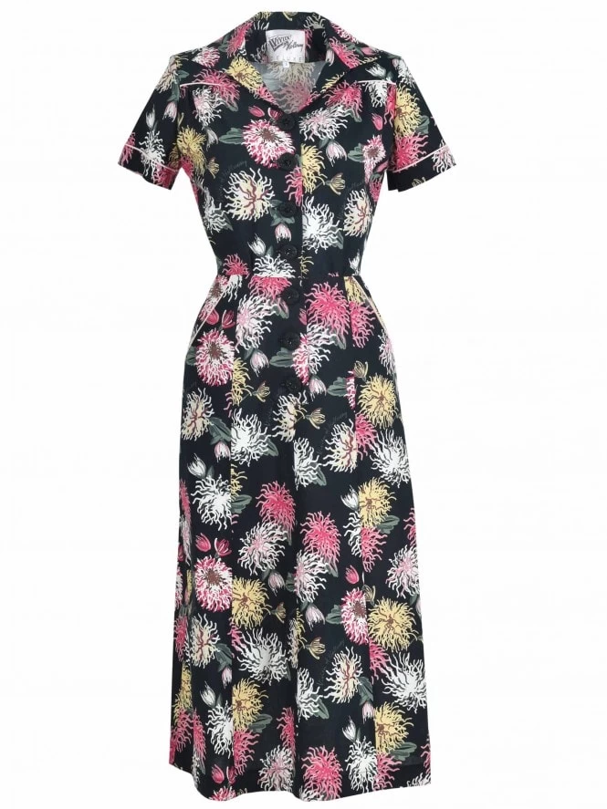 This cute dress features cute piping detail and a button-through blouson top that’s slightly gathered at the waist and bust with gently padded shoulders, to give that authentic 1940s silhouette. The A-line skirt skims over your hips and arrives below the knee. She of course has pockets, a lovely design feature and a practical essential.