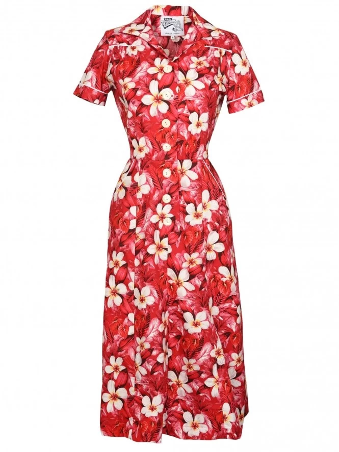 This cute dress features cute piping detail and a button-through blouson top that’s slightly gathered at the waist and bust with gently padded shoulders, to give that authentic 1940s silhouette. The A-line skirt skims over your hips and arrives below the knee. She of course has pockets, a lovely design feature and a practical essential.