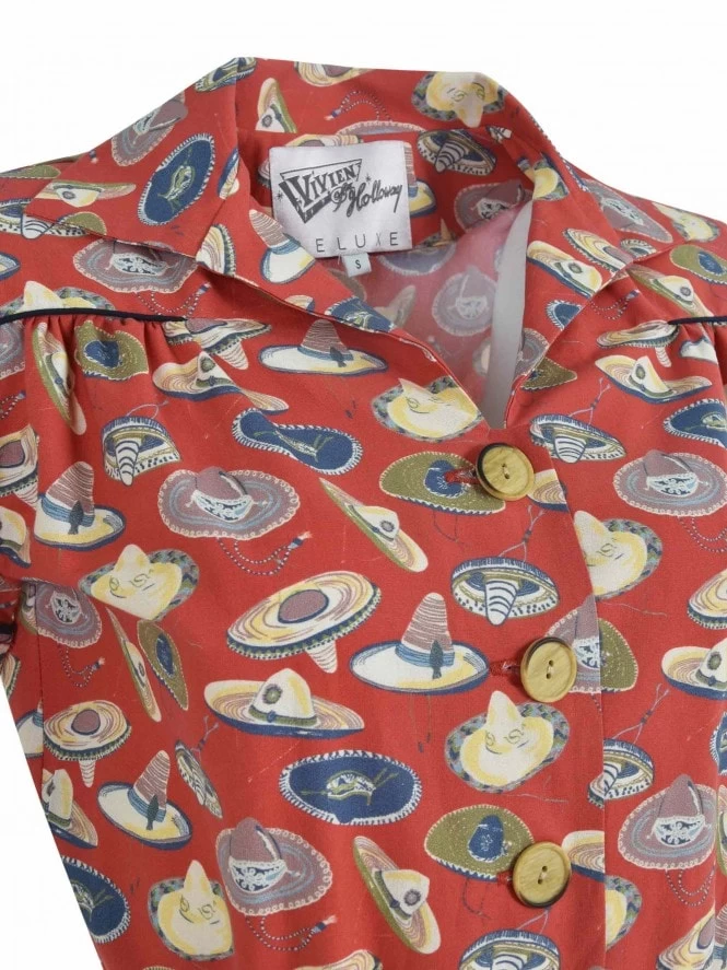 This cute dress features cute piping detail and a button-through blouson top that’s slightly gathered at the waist and bust with gently padded shoulders, to give that authentic 1940s silhouette. The A-line skirt skims over your hips and arrives below the knee. She of course has pockets, a lovely design feature and a practical essential.