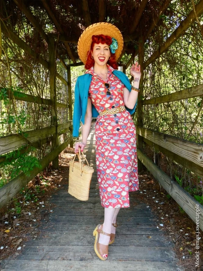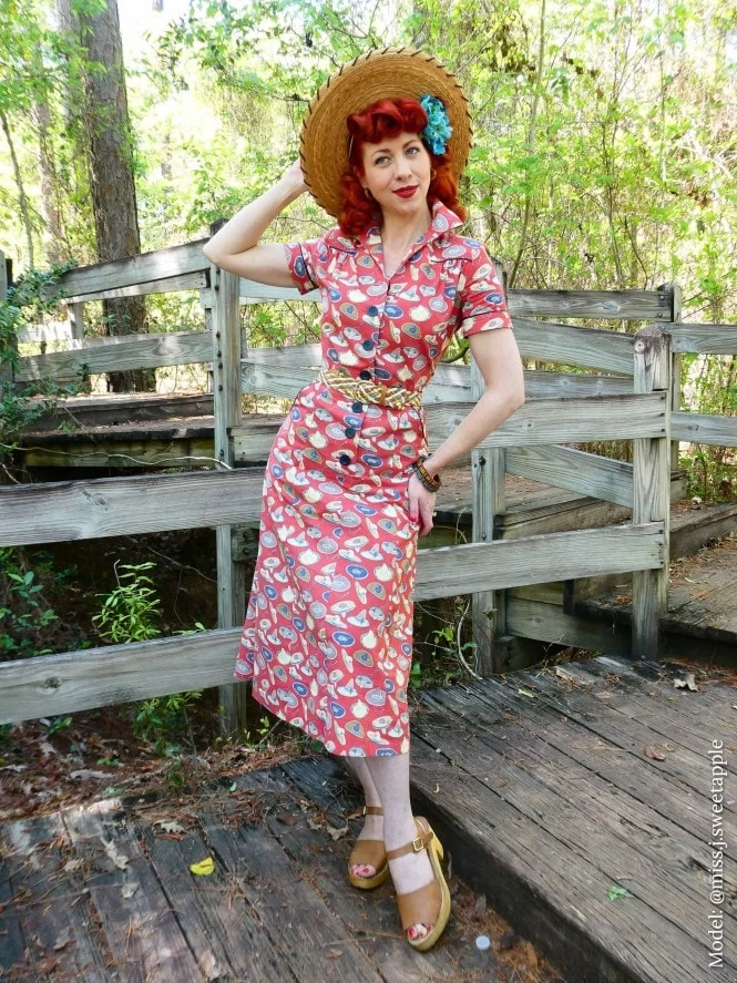 The 1940s Tea Dress is one of the most sought-after styles in a vintage-lover’s wardrobe. This gorgeous dress true to the utility styles of WWII while being slightly updated to suit modern figures and sensibilities. I was inspired to make it by a photograph of my mother during the 40’s. You can see more about that in our blog.