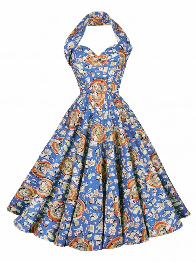 Our fabulous 1950s Halterneck Circle Dress is here in our beautiful bespoke print, just perfect for the sunshine!