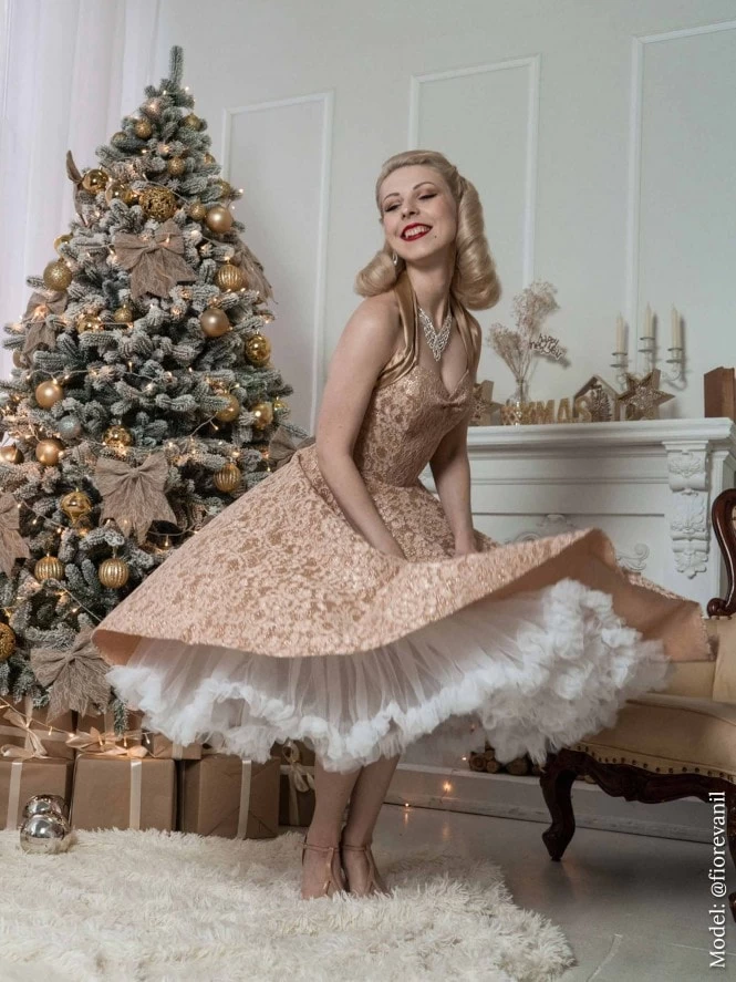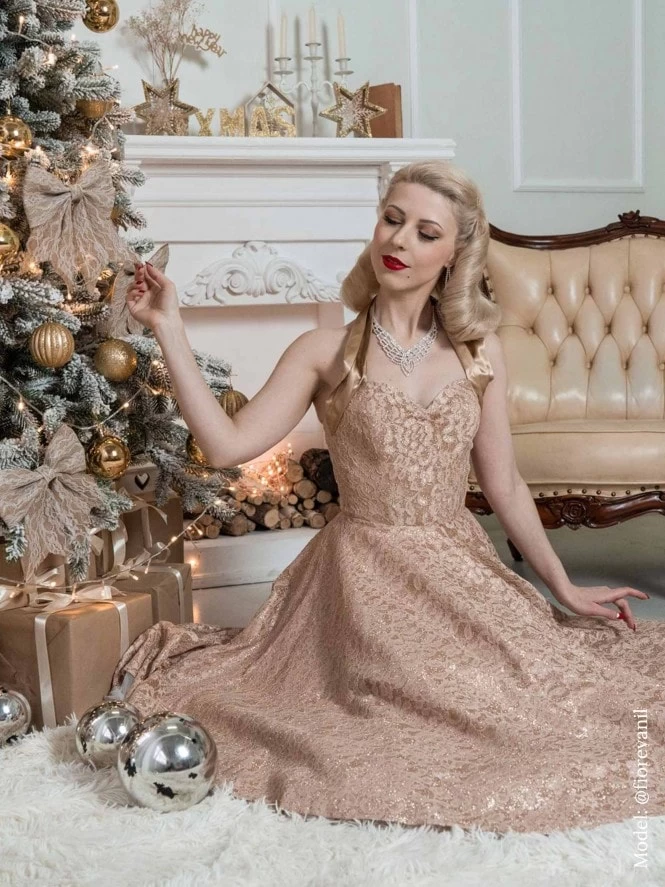 Our fabulous 1950s Halterneck Circle Dress is here in a beautiful Sparkle Fabric, the colours are just perfect for the Parties or to twinkle in the sunshine! You can guarantee you will leave a little sparkle everywhere you go in this dress, it drapes elegantly and there is nothing subtle about this sparkle.