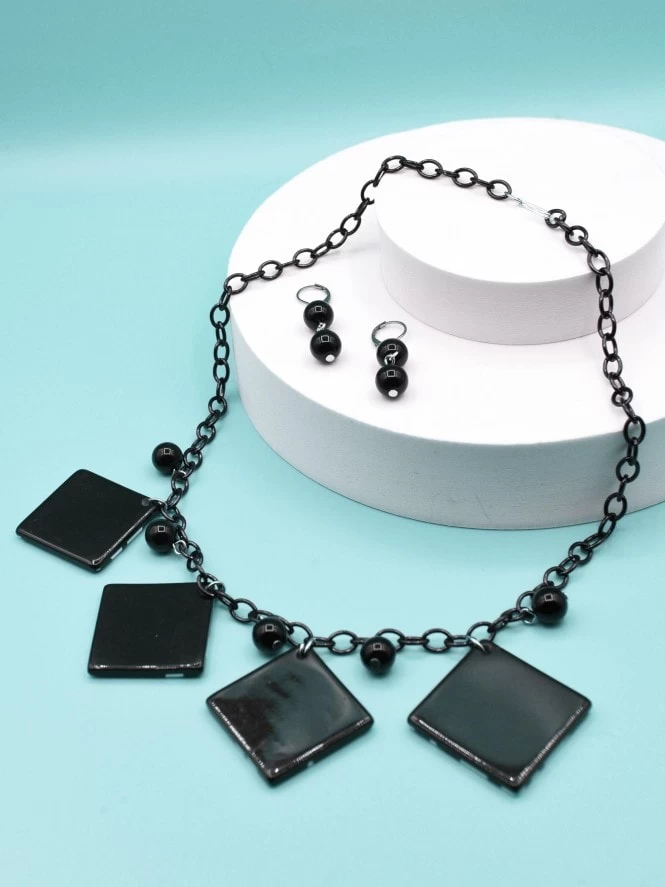 Add a little extra to your jewellery collection with this fun vintage novelty-inspired necklace and earrings set handmade in Hollywood, USA. Can also be worn in reverse! Don’t forget to look at our bangles selection to match!