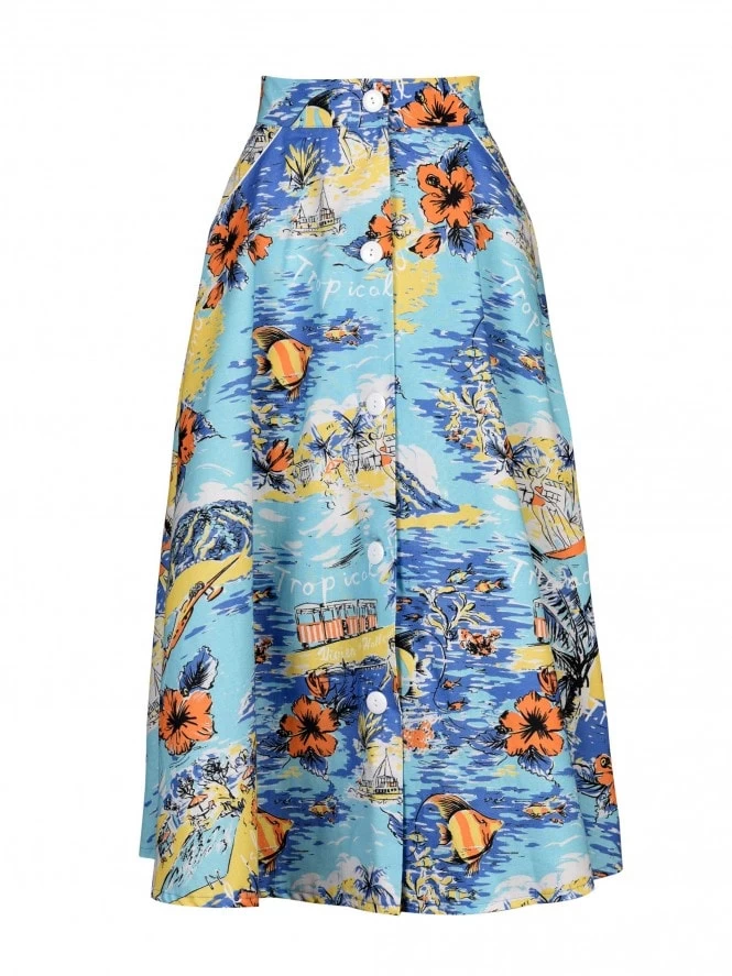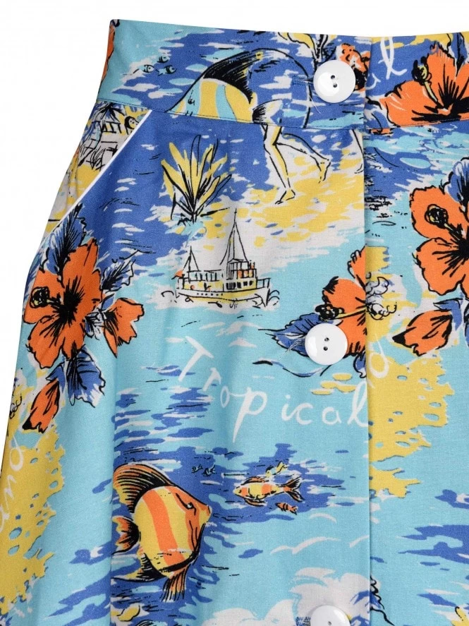 A full Aline shape with piped side pockets. She buttons down the front to show as little or as much leg as you like. Just perfection when teamed with our sun top and Shorts.