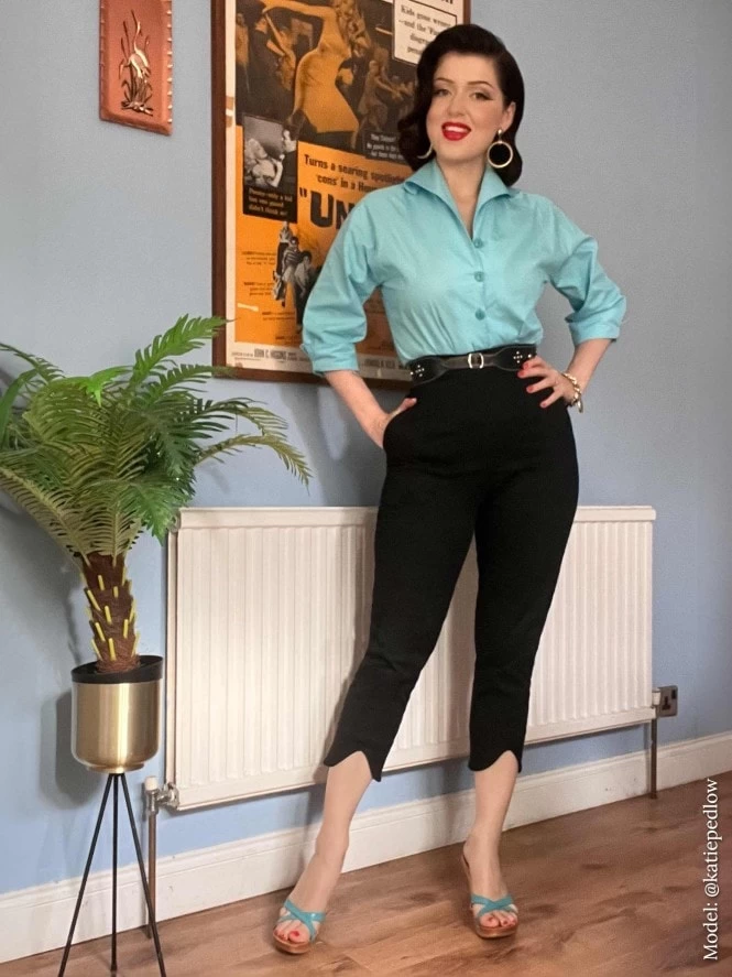 Our trademark high-waisted Pedal Pushers now have a cousin. These are a must in your Summer wardrobe with side zip and Cute Scoop at the front. These gorgeous slimline pants are wonderfully flattering and they certainly make the most of your curves!