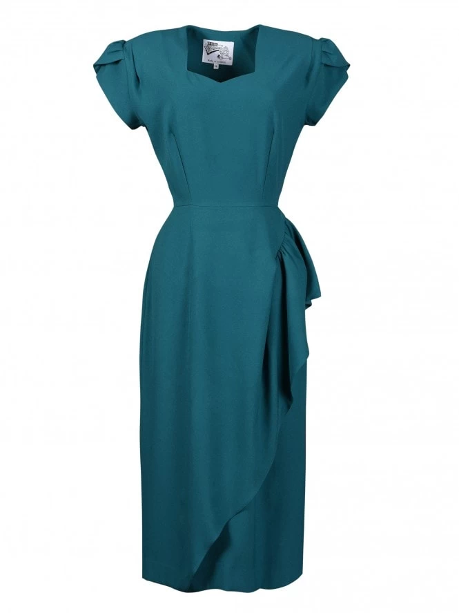 Reincarnation of our very first 1940’s style dress, Gloria drapes beautifully over your curves for a truly authentic feel and look. She has a Sweetheart neck, tulip sleeves, nipped-in waist, and waterfall effect on the hip for just a flash of leg.