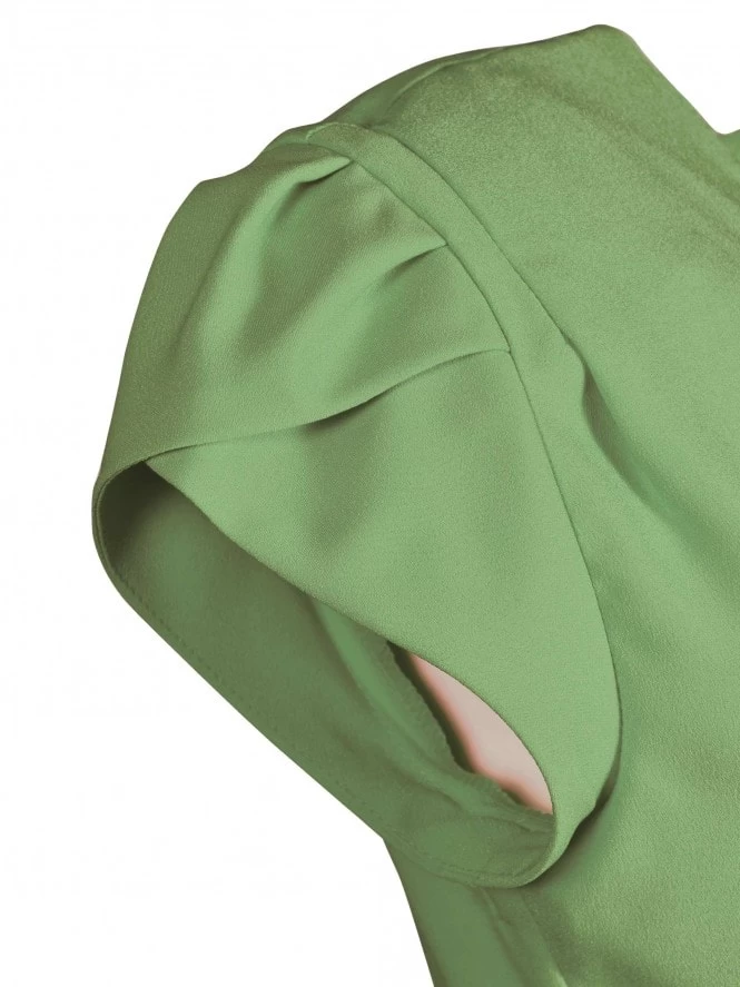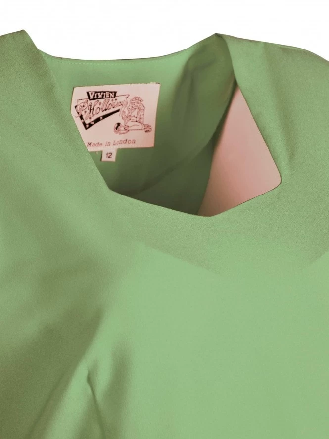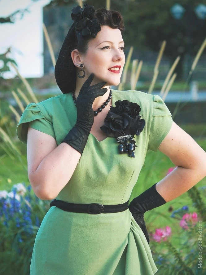 Reincarnation of our very first 1940’s style dress, Gloria drapes beautifully over your curves for a truly authentic feel and look. She has a Sweetheart neck, tulip sleeves, nipped-in waist, and waterfall effect on the hip for just a flash of leg.