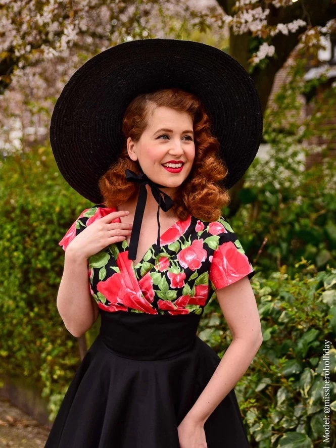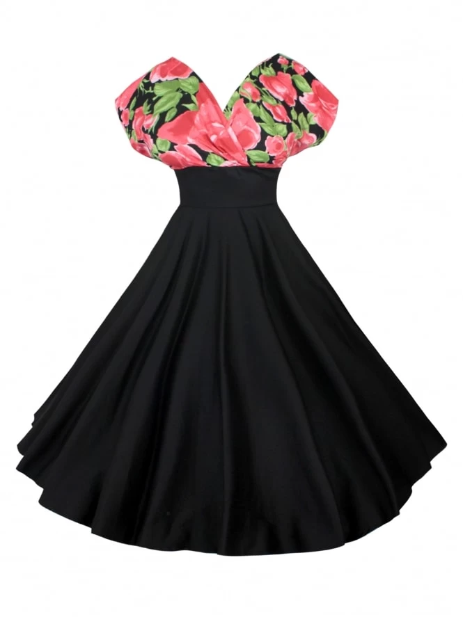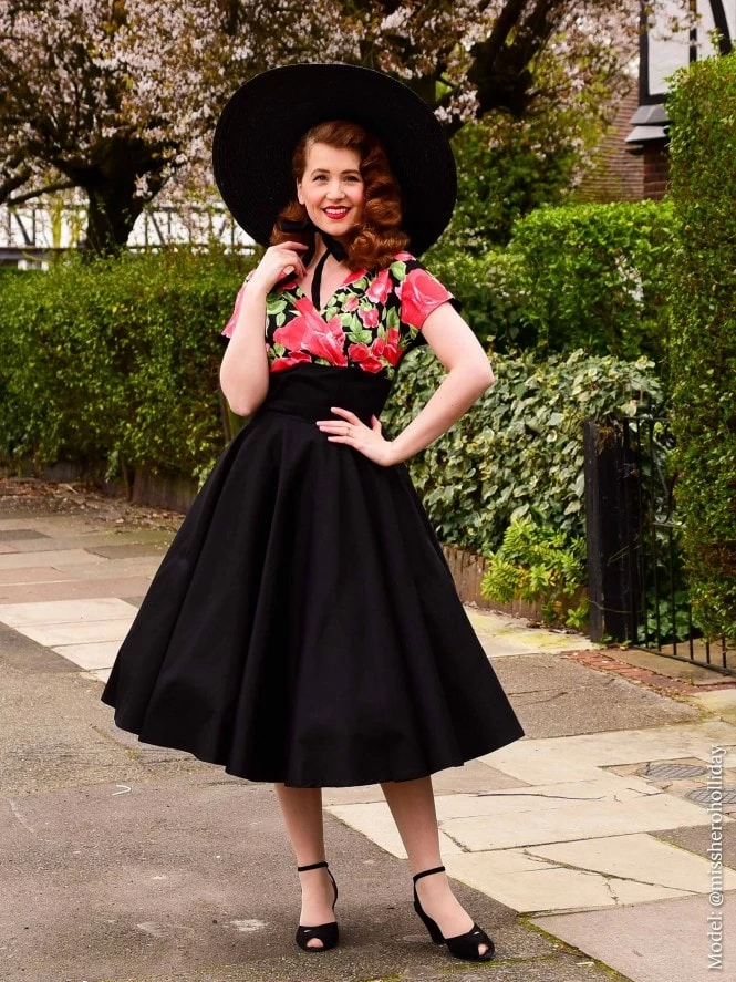 The contrasting bust has the magic ability to slim your body while accentuating your bust. Just the way we like it! She has a luxurious wrap-over top that covers a large bust without hiding your shape. With a smaller bust, all the extra fabric gives the impression you have more to hide. You can swish elegantly into any room with this beautiful full skirt. The elegant V-shaped back gives that extra touch of old Hollywood glamour!