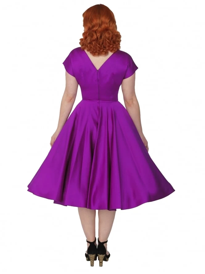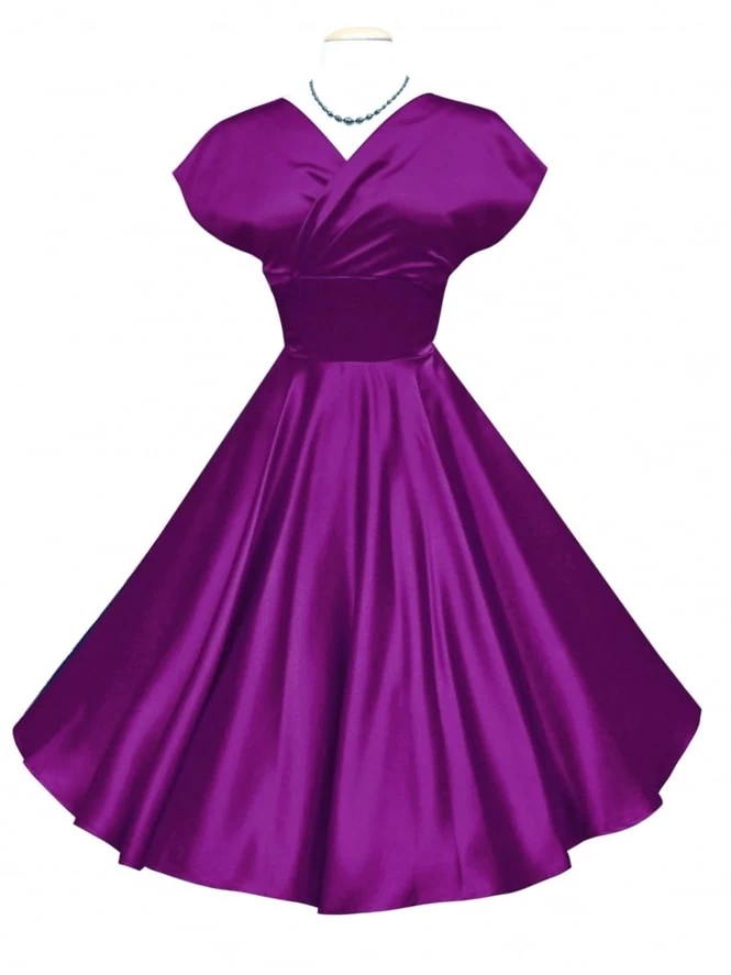 She has a luxurious wrap-over top that covers a large bust without hiding your shape. With a smaller bust, all the extra fabric gives the impression you have more to hide. You can swish elegantly into any room with this beautiful full skirt. The elegant V-shaped back gives that extra touch of old Hollywood glamour!