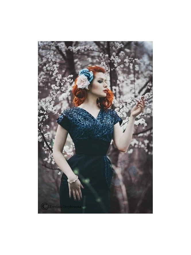 She has a luxurious wrap over top which covers a large bust without hiding your shape. With a smaller bust, all the extra fabric gives the impression you have more to hide. The curve-hugging skirt will have every eye following you as you wiggle by. With a mini peplum to distract from bumps you may want to hide. The elegant V-shaped back gives that extra touch of old Hollywood glamour!