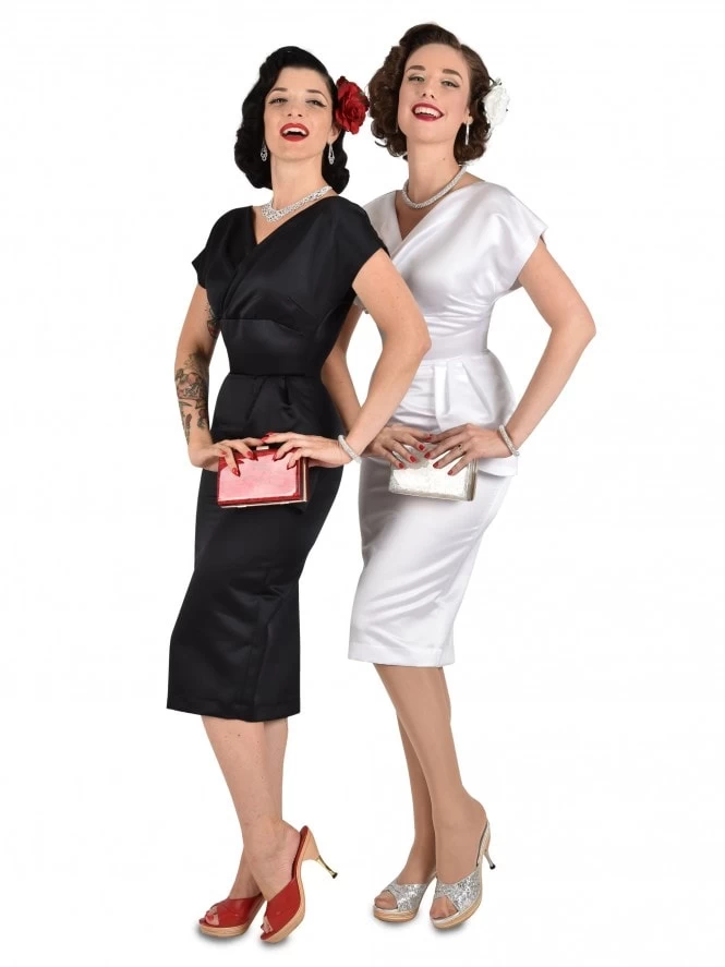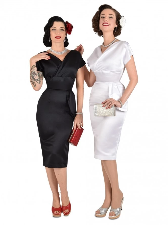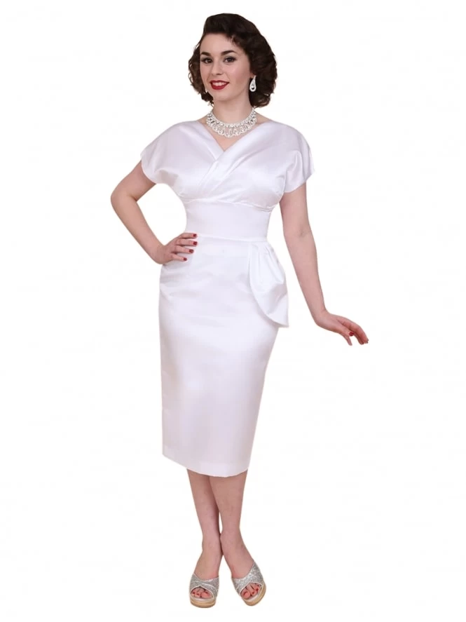 She has a luxurious wrap over top which covers a large bust without hiding your shape. With a smaller bust, all the extra fabric gives the impression you have more to hide. The curve-hugging skirt will have every eye following you as you wiggle by. With a mini peplum to distract from bumps you may want to hide. The elegant V-shaped back gives that extra touch of old Hollywood glamour!