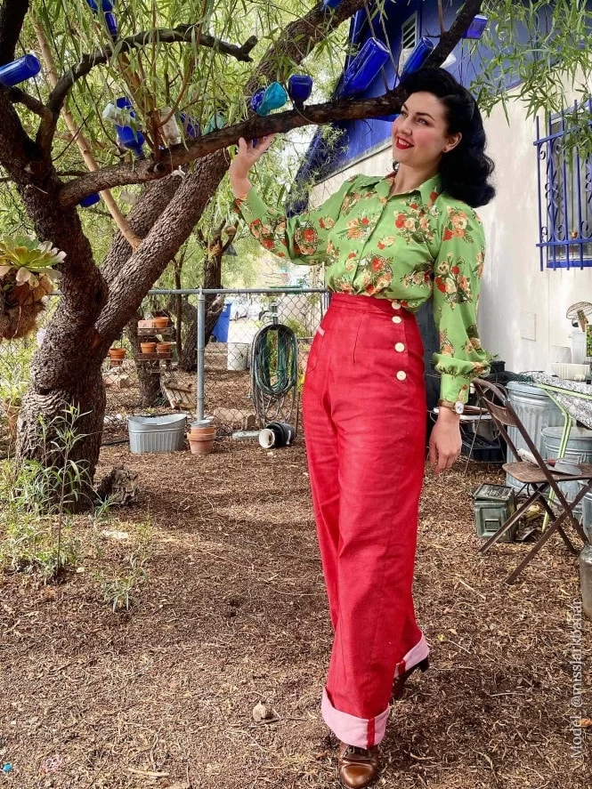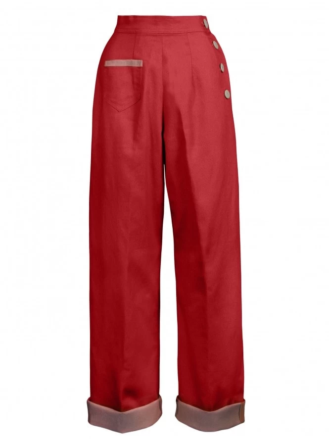 Our signature 1940s Katharine trousers, which have been a real favourite with our customers for years. Based on an original WWII pattern, these super slacks feature an authentic long rise and high waist, cuffs, four side buttons and a small patch pocket on the front. Screen siren or girl next door, everyone can be a vintage vixen in a pair of these flattering trousers.