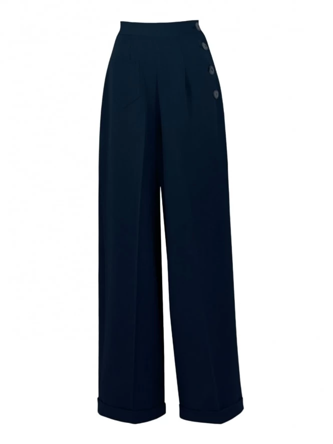 Our signature 1940s Katharine trousers, which have been a real favourite with our customers for years. Based on an original WWII pattern, these super slacks feature an authentic long rise and high waist, cuffs, four side buttons and a small patch pocket on the front. Screen siren or girl next door, everyone can be a vintage vixen in a pair of these flattering trousers.
