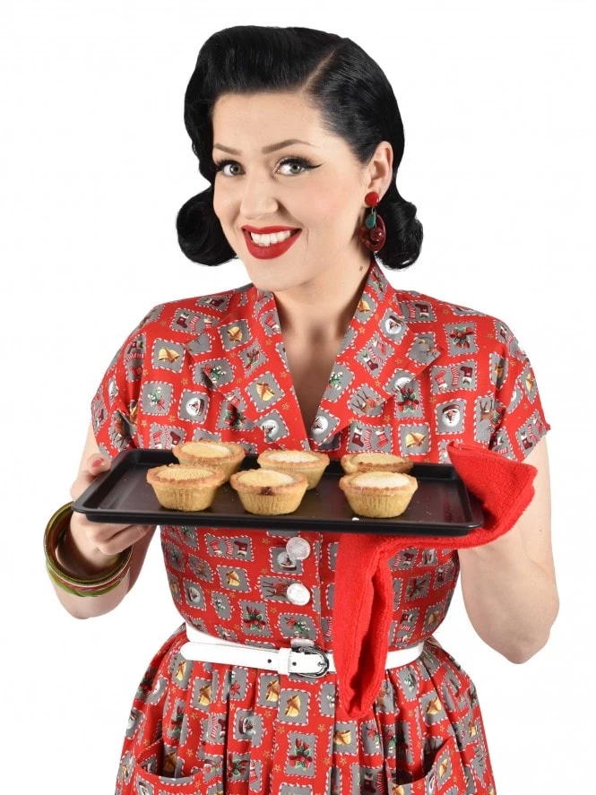 The Kitty has a cutaway collar, cap sleeves, lightly padded shoulders and lovely large pockets on her pleated skirt. She has Vintage Buttons down the front and side zip. What more could you want from a 50s style day dress!
