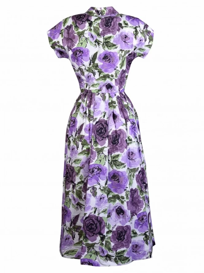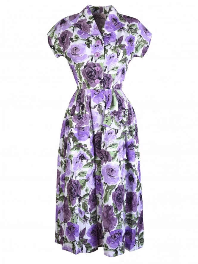 The Kitty has a cutaway collar, cap sleeves, lightly padded shoulders and lovely large pockets on her Pleated skirt. She has Vintage Buttons down the front and side zip. What more could you want from a 50s style day dress!