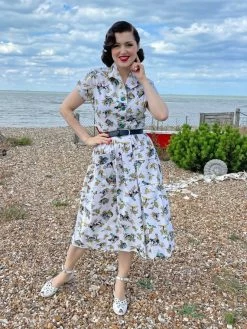 The Kitty has a cutaway collar, cap sleeves, lightly padded shoulders and lovely large pockets on her Pleated skirt. She has Vintage Buttons down the front and side zip. What more could you want from a 50s style day dress!