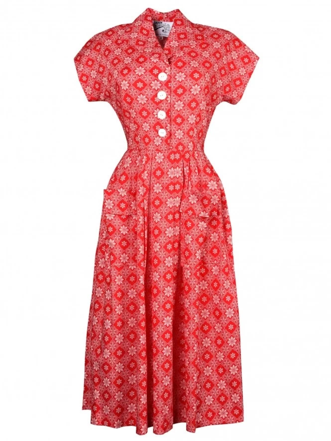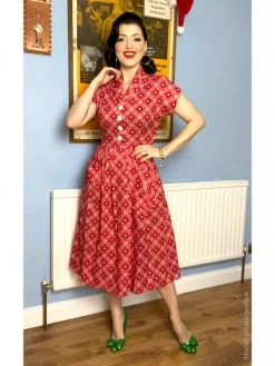The Kitty has a cutaway collar, cap sleeves, lightly padded shoulders and lovely large pockets on her Pleated skirt. She has Vintage Buttons down the front and side zip. What more could you want from a 50s style day dress!