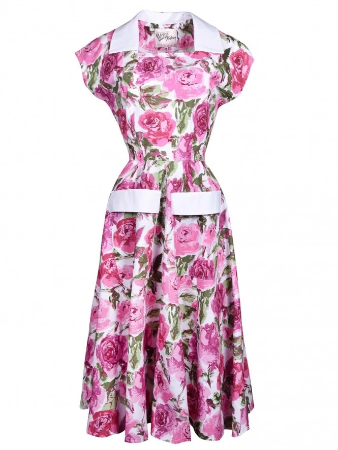 The cute little day dress is accentuated with a contrast collar and pocket cuffs that will brighten up any day.