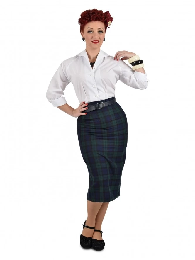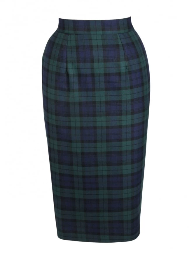 Our 1950s style pencil skirts are carefully designed to make the very most of your dangerous curves. Wearing one you can be a rockabilly femme fatale or a girl-next-door, or whichever takes your fancy at the time! Available in a range of plain fabrics, as well as authentic tweed-look and prince of wales checked cloth, each one is cut to make the most of your waist and hips, so do ensure you measure yourself carefully for the most flattering fit. You’ll be a picture if you pair your skirt with one of our alluring halter neck tops. Accessorise with a hair flower and an air of innocence… or a knowing smile! As all our clothes, these skirts are made right here in England. Length of the skirt is 28 inches.