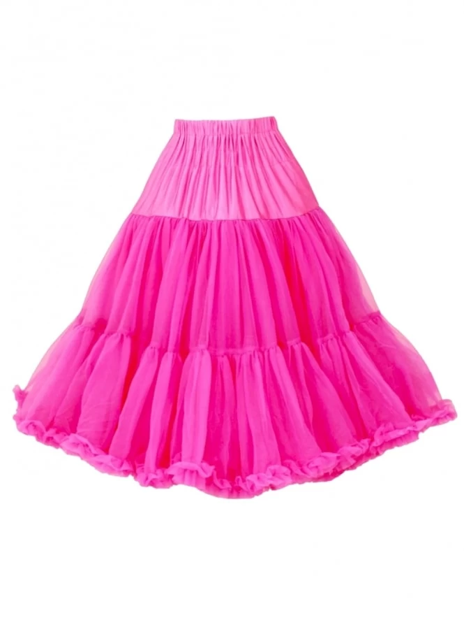 No halterneck circle dress is complete without one petticoat underneath! With an array of colours available, you can choose to match or contrast with your 1950s dress. The frothy layers of chiffon add volume, and this in turn helps make your waist look absolutely tiny. If you have slim hips, you can choose to wear two petticoats layered together, for maximum impact! Not only do they look amazing under our dresses, but when you take a spin on the dance floor, they look spectacular whilst also protecting your modesty! 26″ from waist to hem. Elasticated waistband