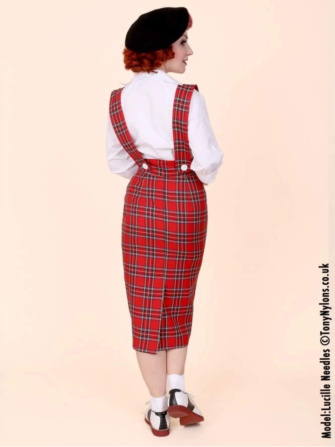 How about this little number? Our Pinafore strap skirt strikes just the right balance between sassy siren and demure secretary… it’s all about how you wear it! Our classic rockabilly-style 1950s style pencil skirt has been transformed by adding an extra-wide waistband and button-on braces for a classic vintage look that’s available in a selection of tartan and plain fabrics. The key to getting the perfect vintage wiggle is all in the fit – it should be tight enough to stretch ever-so-slightly over your curves, but not too much – you do need to sit down! Or perhaps you don’t… Either way, do measure yourself precisely and compare with our size chart before buying.