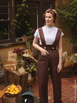 Now they’re back and better than ever! Inspired by those great wartime girls in the Land Army, these slacks feature an authentic high curved waist to cinch you in. A long rise for that authentic ’40s draped look. The Pinafore is made to tease with its wide straps. They have a side zip and a flattering wide-leg to help things really swing on the dance floor!