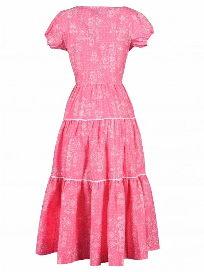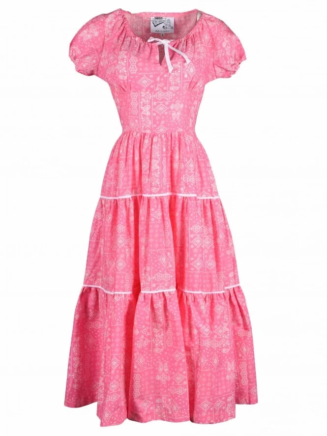 Cute puff sleeves you can wear on or off the shoulder. A fitted bodice and rows and rows of ruffled skirt. Made from a lightweight Cotton she is perfect for Summer.