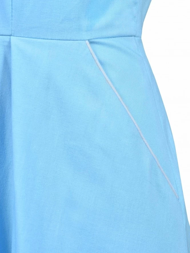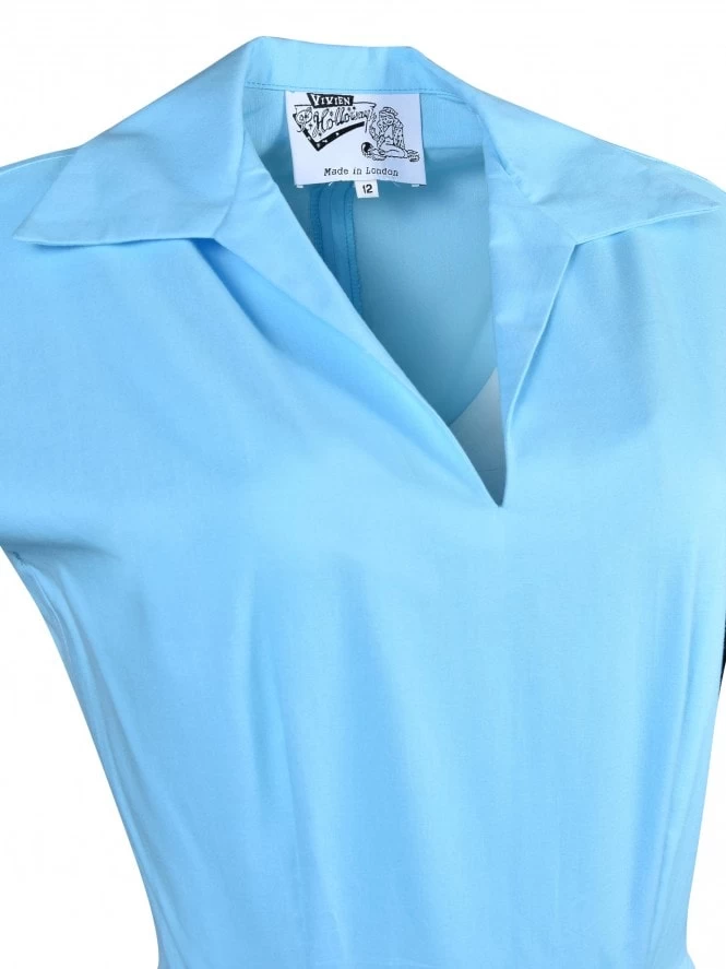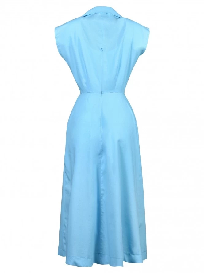 With her cap sleeves, lightly nipped waist and a winged collar leading to a narrow V-neck, Runaround Sue is sure to be popular with you gals about town! She’s practical as well as pretty, with some deep, piped pockets and front pleats on the A-line skirt to allow for plenty of movement.