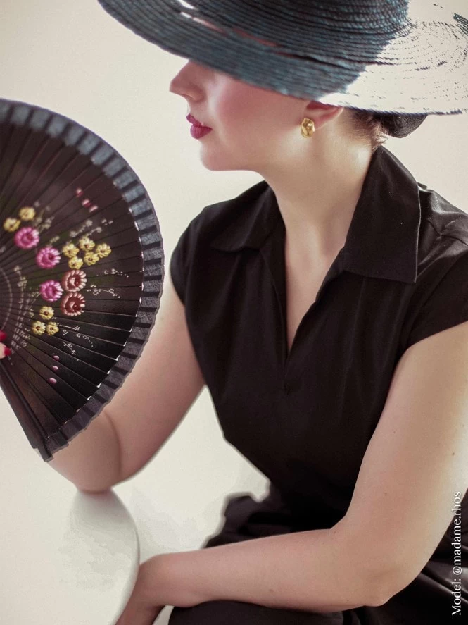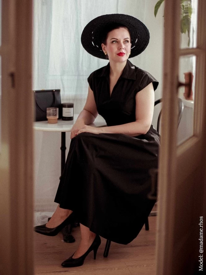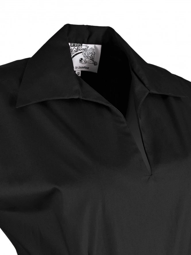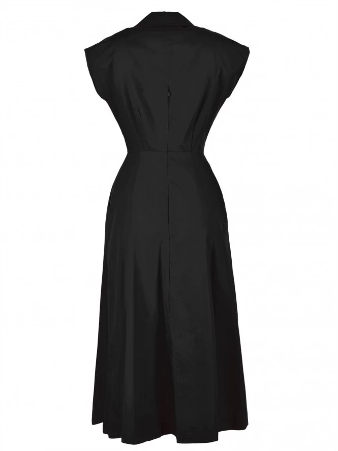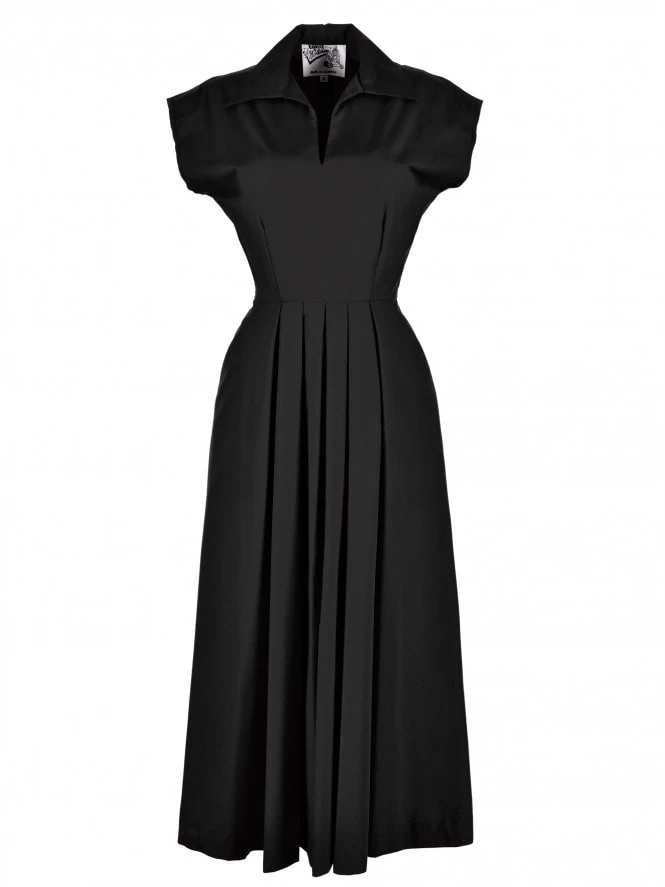 With her cap sleeves, lightly nipped waist and a winged collar leading to a narrow V-neck, Runaround Sue is sure to be popular with you gals about town! She’s practical as well as pretty, with some deep, piped pockets and front pleats on the A-line skirt to allow for plenty of movement.