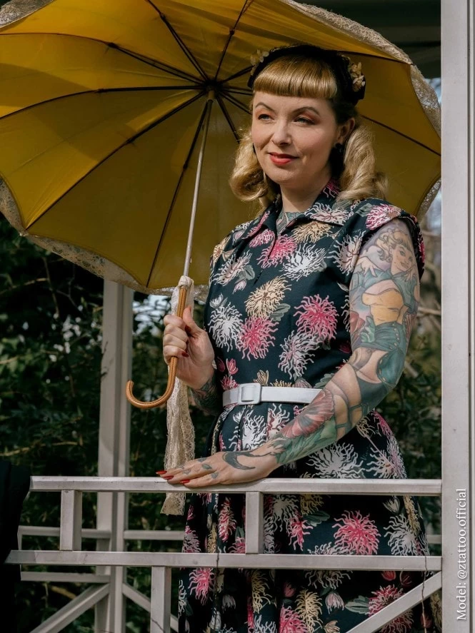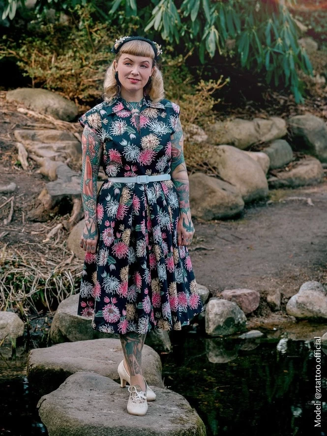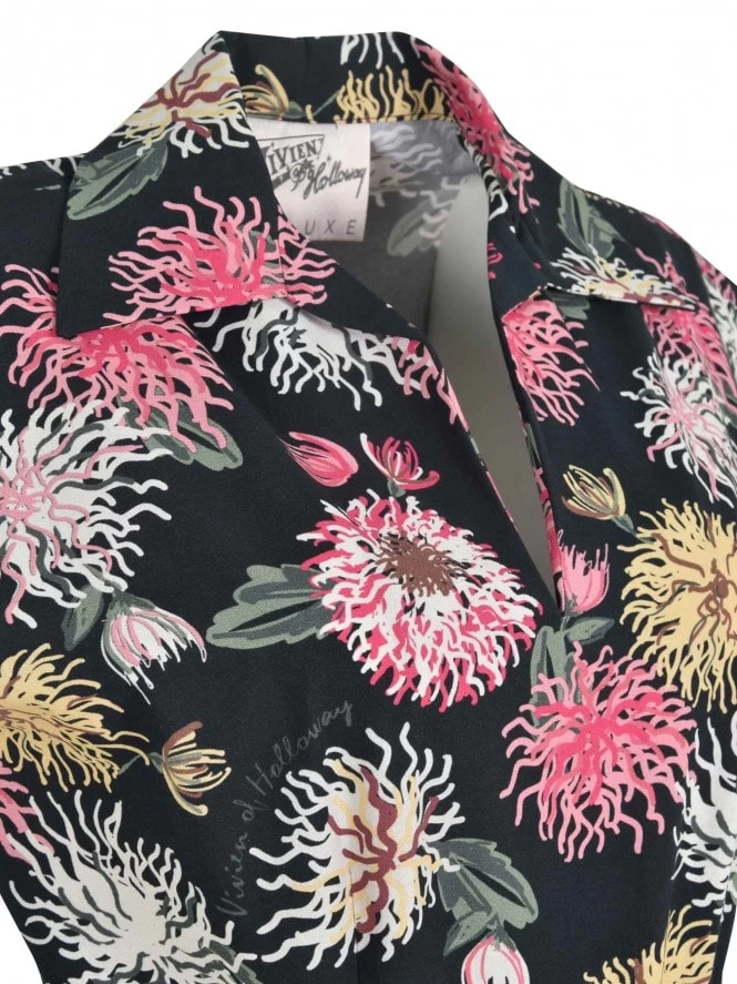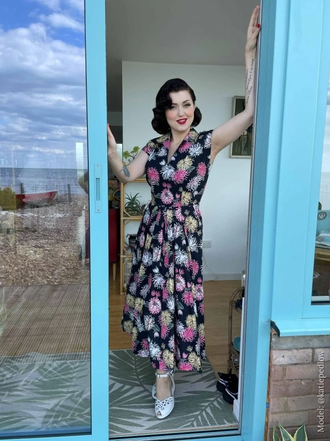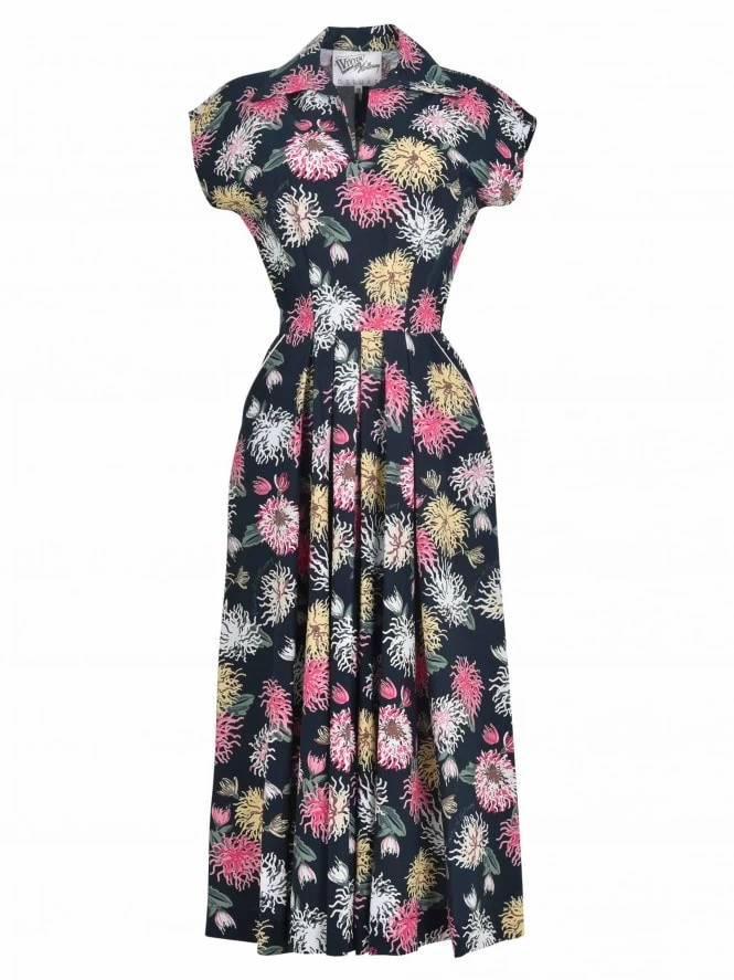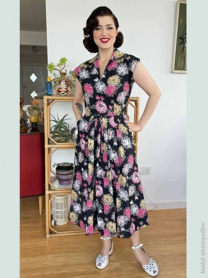 This is one from our Pink Label range. These luxurious dresses are made with our own Bespoke prints. Made by us exclusively with a heavy influence from Vintage fabrics.