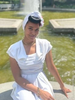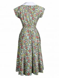 With her cap sleeves, lightly nipped waist and a winged collar leading to a narrow V-neck, Runaround Sue is sure to be popular with you gals about town! She’s practical as well as pretty, with some deep, piped pockets and front pleats on the A-line skirt to allow for plenty of movement.