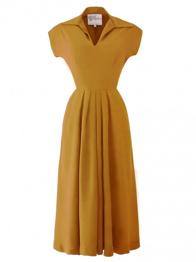 With her cap sleeves, lightly nipped waist and a winged collar leading to a narrow V-neck, Run around Sue is sure to be popular with you gals about town! She’s practical as well as pretty, with some deep, piped pockets and front pleats on the A-line skirt to allow for plenty of movement.