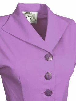 With her cap sleeves, lightly nipped waist and a winged collar leading to a narrow V-neck, Run around Sue is sure to be popular with you gals about town! She’s practical as well as pretty, with some deep, piped pockets and front pleats on the A-line skirt to allow for plenty of movement.