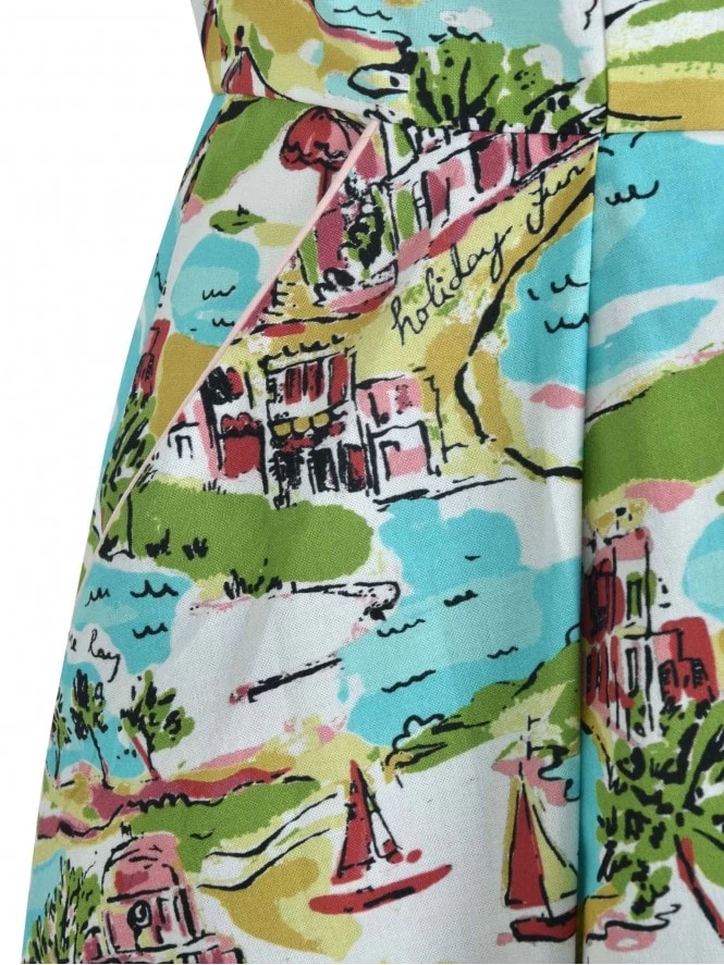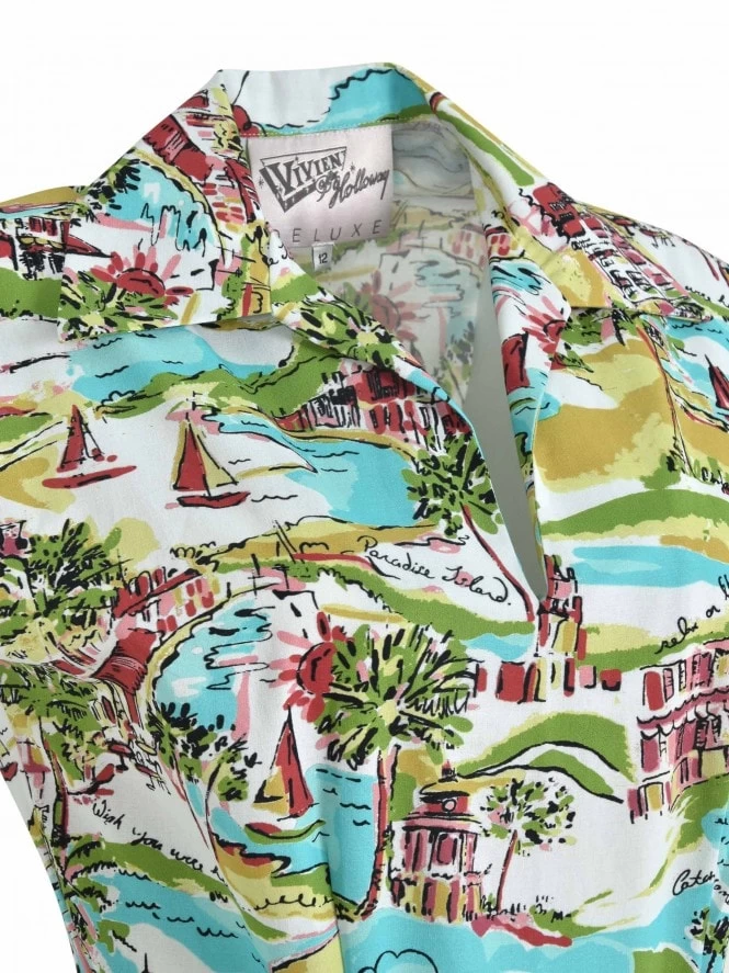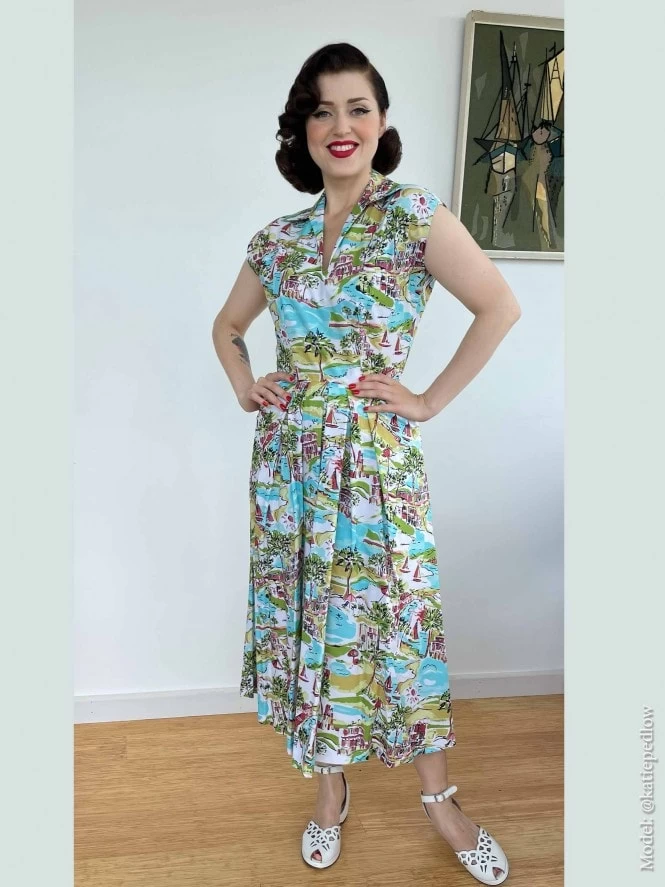 With her cap sleeves, lightly nipped waist and a winged collar leading to a narrow V-neck, Runaround Sue is sure to be popular with you gals about town! She’s practical as well as pretty, with some deep, piped pockets and front pleats on the A-line skirt to allow for plenty of movement.
