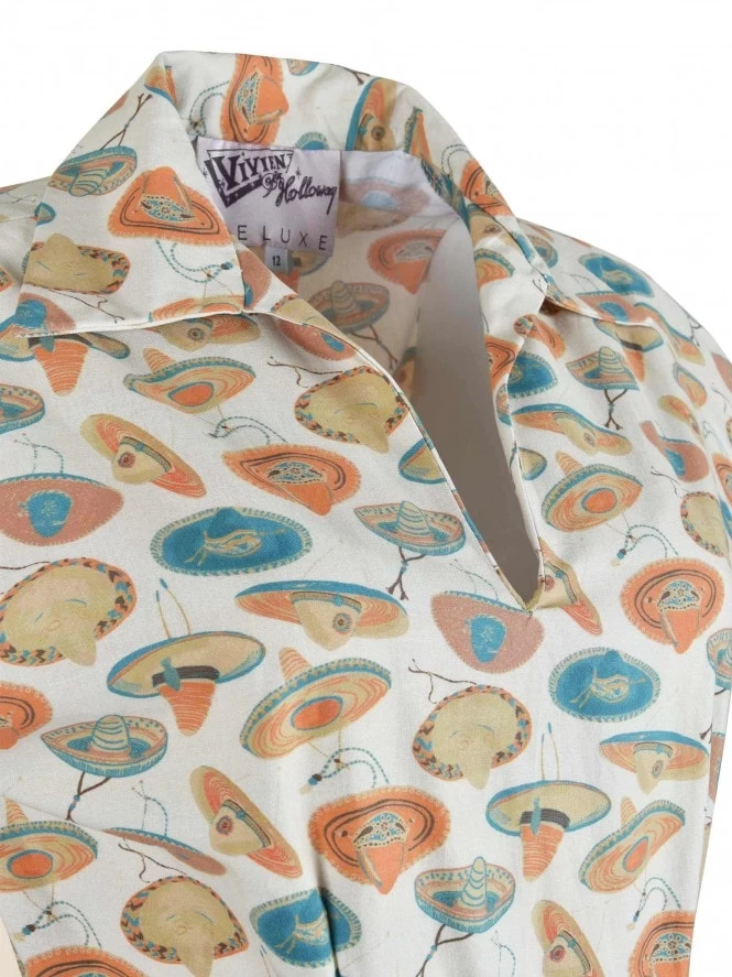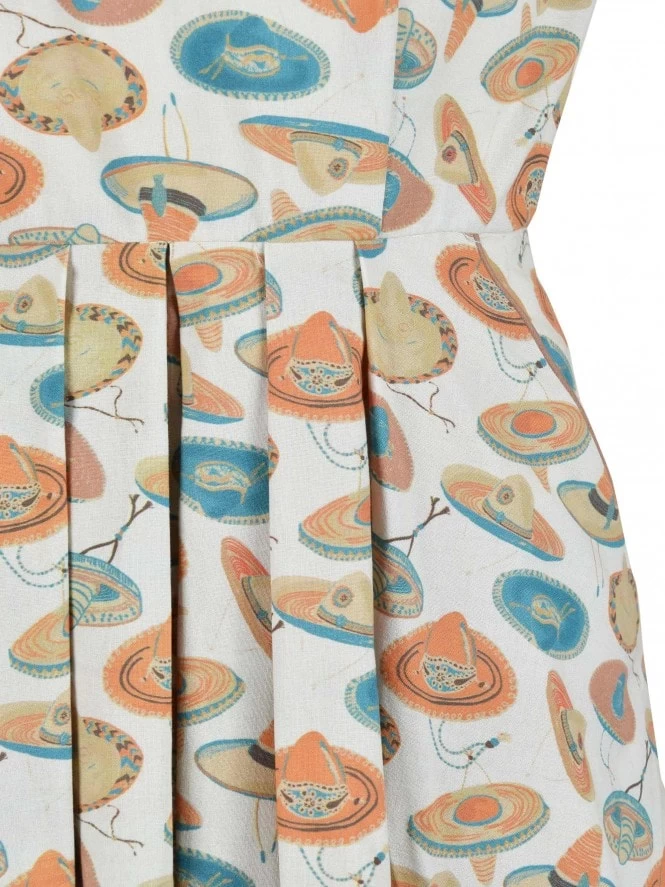 With her cap sleeves, lightly nipped waist and a winged collar leading to a narrow V-neck, Runaround Sue is sure to be popular with you gals about town! She’s practical as well as pretty, with some deep, piped pockets and front pleats on the A-line skirt to allow for plenty of movement.