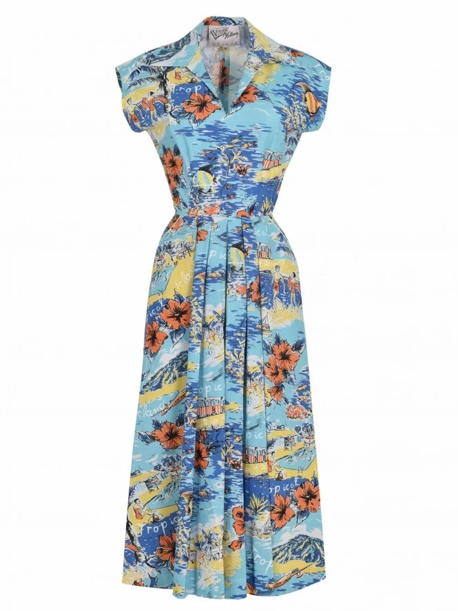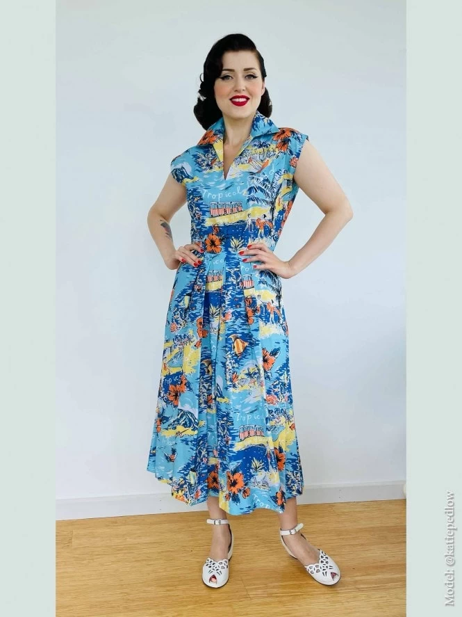 With her cap sleeves, lightly nipped waist and a winged collar leading to a narrow V-neck, Runaround Sue is sure to be popular with you gals about town! She’s practical as well as pretty, with some deep, piped pockets and front pleats on the A-line skirt to allow for plenty of movement.