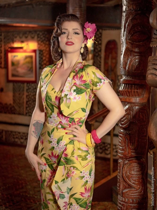 Our Sarong and Bolero Sets are inspired by 1940s starlet Dorothy Lamour, who starred in a number of South Pacific-themed films and musicals back in the Golden Era. We’ve created our own version with a boned bodice to nip in your waist and a perfectly draped sarong skirt to hide any unwanted bulges or give the impression of more shapely hips whichever is needed.