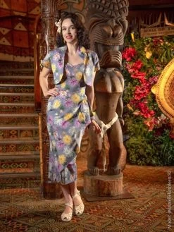 Our Sarong and Bolero Sets are inspired by 1940s starlet Dorothy Lamour, who starred in a number of South Pacific-themed films and musicals back in the Golden Era. We’ve created our own version with a boned bodice to nip in your waist and a perfectly draped sarong skirt to hide any unwanted bulges or give the impression of more shapely hips whichever is needed.